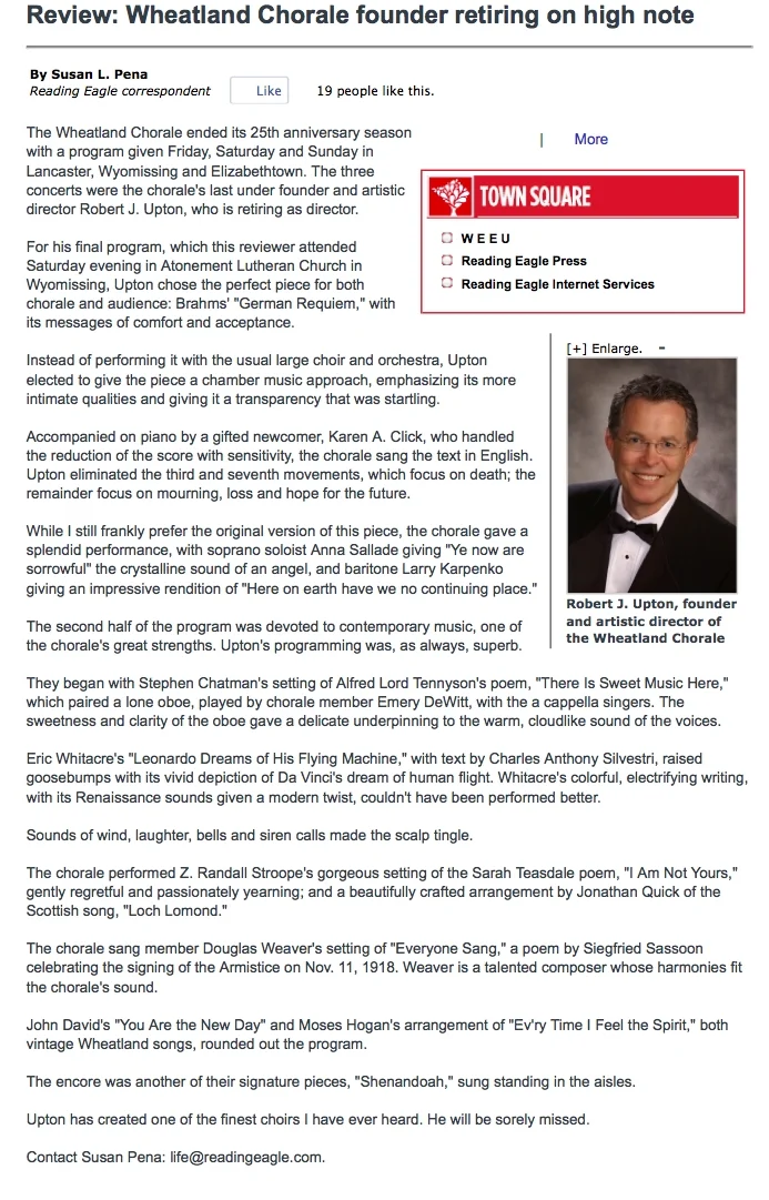 Beyond her accomplishments in piano, Dr. Click is a talented vocalist who has contributed her voice to many ensembles. She has performed with groups such as the Washington Chorus, the Susquehanna Chorale, and the Wheatland Chorale. She also served as a soprano soloist for the Central PA Oratorio Society, under the baton of conductor and revered choral composer Bob Chilcott, in the performance of his own Requiem.